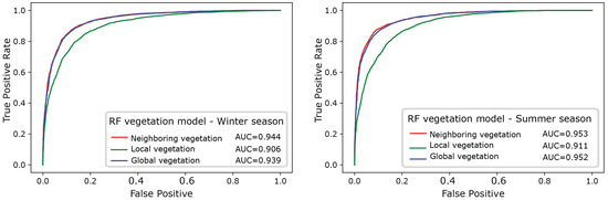 ROC curves for the three RF vegetation models and corresponding AUC values.