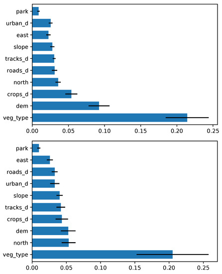 The partial dependence plot (Figure 11) allows one to infer the magnitude of the relevance of each single vegetation class, and to detect whether a particular type of vegetation is important because it is associated with high or low fire susceptibility. The pixel-related local vegetation categories follow on average similar patterns as their neighboring counterparts. However, it emerges from Figure 11 that, for the summer wildfire susceptibility model, areas with mixtures of crops and natural vegetation, pastures, moors, shrubs, mixed forest, schlerophyllus vegetation, and Mediterranean pines were associated with high levels of fire susceptibility; and beech forests, hop/hornbeam forest, and turkey oak are associated with low levels of susceptibility. For what concerns winter wildfire susceptibility, from Figure 11, it is evident that pastures, mixed forests, moors and shrubs, mixed crops/natural areas, and downy oaks are characterized by high susceptibility; and sessile oaks, beech holm, mountain pines, and Turkey oak are associated with low susceptibility patterns.