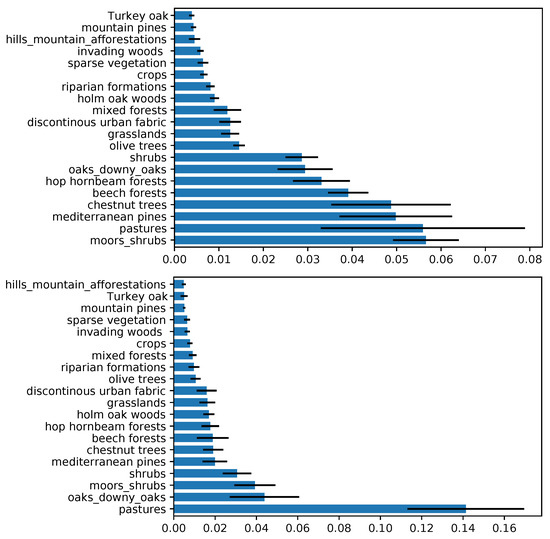 Vegetation was by far the most important variable, as clearly shown in Figure 9. Here, the local type of vegetation has a normalized MDA of about 0.2 for both the seasons, followed by orographic variables such as elevation and northness. The other variables usually plateau below 0.05. In order to have a clear display, the ranking of the first neighboring vegetation classes are represented in a another plot (Figure 10). In summer, the contributions of moors, shrubs, Mediterranean pines, chestnut trees, beech, hop and hornbeam forests, oaks, and downy oaks to the vegetation mosaic are predominant; and in winter the presence of pastures plays a major role, followed by oaks and moors/shrubs.