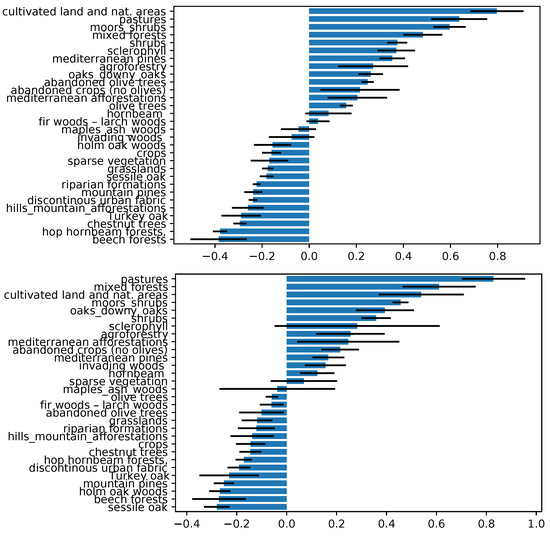 Partial dependence plot of the categorical variable corresponding to the local vegetation, for the RF model with global vegetation input set. Summer and winter are portrayed on the top and the bottom, respectively. The blue bars represent the means of the importance score among all the folds, and black lines represent the standard deviation.