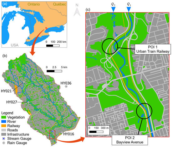 The Don River Basin, located in the Greater Toronto Area, Ontario, Canada (Figure 1a), has a total area of approximately 350 km2, baseflow of approximately 4.5 m3/s, and land cover predominantly characterized by urban infrastructure (Figure 1b). The catchment is managed by the Toronto and Region Conservation Authority (TRCA). The high level of soil imperviousness, the channelization of large portions of the Don River and its tributaries, and a smooth relief result in a scenario of high propensity to flash flood [23], as also observed in other urban catchments surrounding the Great Lakes [24]. The response time of the catchment is in the order of 2.5 to 3 h and the southern region of the catchment recurrently reaches river overbank conditions, which results in significant socio-economic impacts mainly related to the inundation of high-traffic areas [25]. In this context, two points of interest (POIs) are taken into consideration: POI 1 refers to the location in which an urban train became stranded during the historical flood of July 2013, while POI 2 refers to a point on Bayview Avenue usually closed due to floods (Figure 1c). Properly predicting the occurrence/absence and the intensity of inundation scenarios in such locations is of particular interest for decision makers to drive the choice of taking (or not) actions with significant impact to local commuters, such as temporarily stopping train services (for POI 1) and blocking access to affected streets (POI 2).