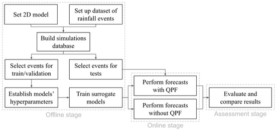 Forecasts produced by early warning systems are usually based on hydrographs issued for specific point locations of an open channel, which are extremely important for identifying scenarios of river overflow. However, the absence of flood inundation maps forecasted in real time can limit the ability of decision makers to take informed actions due to the importance of spatio-temporal data for first responders. Using conventional two-dimensional (2D) and quasi-2D hydraulic models based on physical representation of the water flow is considered the most accurate approach for simulating the development of flood inundations, especially for flashy catchments, given the relevance of momentum in the water movement [5]. Such simulations require solving large sets of intercorrelated Saint-Venant equations, which leads to extensive computational demands that limit the real-time execution of the hydraulic models as part of operational flood forecasting chains. Instead, such hydrodynamic models are usually executed “offline”, when processing time is not a constraint, and the generated maps are used for the establishment of flood risk maps [6,7], which are valuable resources for the management of catchments. While new hydrodynamic models are being proposed to explore growing sources of processing power, such as graphic processor units and cloud computing [8,9,10], adopting such new technologies by members of established forecasting centers may be challenging considering the need to migrate already-implemented models and implement potentially demanding structural changes in the data system.