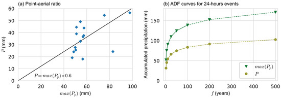 Figure 3a presents the observation values used to define the ARF. Each 24-h precipitation record with accumulation values higher than 46 mm (i.e., the total accumulated precipitation estimated for rainfalls within a return period of 50 years) is represented as a point. The respective regression line is characterized by a slope (the aerial-point rainfall ratio) of 0.6, which was used as the ARF.