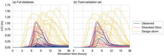 Figure 4 presents the timeseries of the AID of all 108 simulated rainfall events in the simulations database and of the 36 rainfall events selected using the CADEX method. It is possible to note that, despite being composed of only one-third of the total number of records, the AID timeseries of the rainfall events in the training/validation set (Figure 4b) present a variety of forms comparable with the full dataset (Figure 4a). The majority of events that were not included in the training/validation set are characterized by their lower intensity and high recurrency due to their mutual similitude. Conversely, all simulations using design storms, which are designed to have heterogeneous shapes and less recurrent intensities, were included in the training/validation set. A summary of the composition of each set is given in Table 2.