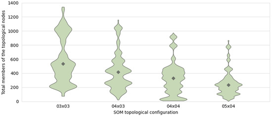 There is not a consensus on how to determine the number of topological nodes of a SOM. In this work, an empirical approach is adopted taking into consideration that a SOM model is valuable as long as it is able to identify patterns shared by different inundation maps (generalization power) without losing the capability to differentiate records distant between each other in the feature space (discretization power). For such, the following algorithm was applied: (1) a SOM with small topological dimension, = 3 and = 3, is trained using all of the training/validation dataset; (2) if all of the topological nodes had 2 or more inundation maps associated to them, the trained SOM is considered “valid”, the value of (or if < ) is increased by 1, and the algorithm returns to step 1; and (3) the iterations proceed until at least one topological node in the trained SOM is composed of a single record of the training dataset (SOM considered “invalid”). The values of and of the last “valid” SOM are then fixed and adopted in further steps. Figure 5 presents how the number of records of each topological node varied with the change of the topological map size. As the SOM with topological dimensions of 05 × 05 was considered “invalid”, it was not included in the plot and the immediate antecedent topological configuration (of 05 × 04) was selected as the fixed dimensionality for the SOMs trained and used in the subsequent steps.