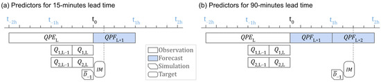 Temporal representation of the predictors of the NARX models trained for lead times of (a) 15 min and (b) 90 min assuming an issue time .