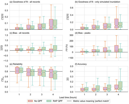For the most part of the simulated timeseries, the outputs produced by the hydrodynamic model were within, or close to, the 80% confidence interval of the forecasts produced by the surrogate models, indicating that the use of the -fold ensemble was successful in capturing the additional uncertainties of the surrogating step. The inclusion of QPF products did not significantly impact the maps forecasted for lead times up to 2 h. For longer lead times, the no-QPF models tend to produce forecasted peaks biased high and with high spread. Conversely, the inclusion of QPF results in less biased peaks with the tread-off of producing more peaks that were not present in the hydrodynamic simulations, which could trigger false alarms during operational time. Such findings suggest that a forecasting system composed of a combination of no-QPF and QPF-aware surrogate models has the potential to produce more accurate and less biased forecasts for longer lead times; however, exploring strategies for such combination is beyond the scope of this study.