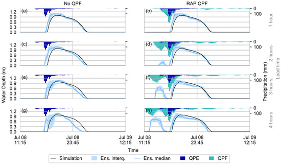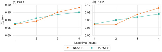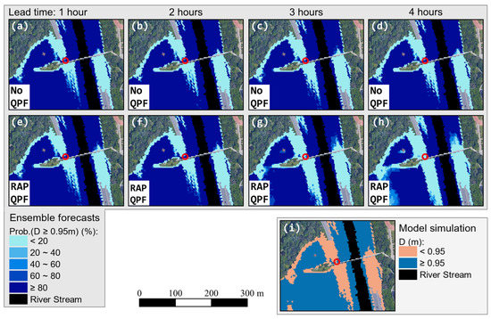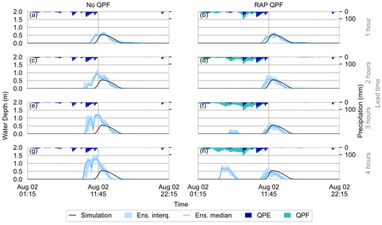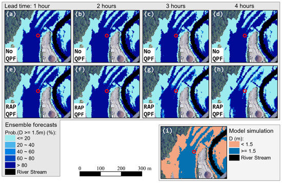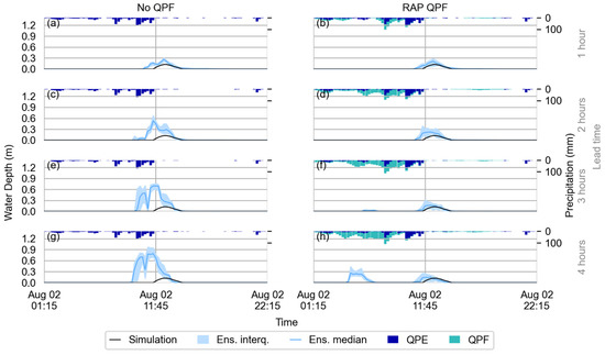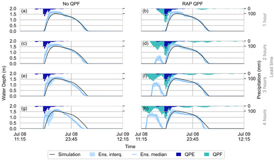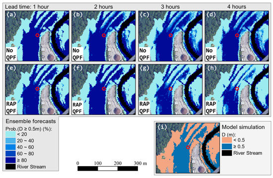 To facilitate visual interpretation, only timeseries and inundation maps of forecasts issued for lead times of 1, 2, 3, and 4 h are presented, despite results being available at a 15-min time step. For the sake of simplicity, the surrogate models that do not include QPF values in their set of predictors are referred to as “no-QPF” or “No QPF”, while the models that have RAP QPF values as part of their predictors are referred to as “QPF-aware” or “RAP QPF” hereafter.