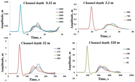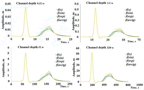 A series of numerical experiments from Table 1 were then carried out. Coefficient ksour was chosen according to Equation (21). The character of the curve of the coefficient distribution in the area of the damping zone was a variable parameter. The Figure 5 shows the readings of tide meters for the differently scaled channels for four options of multiplier factor ε distribution. Symbols used in the following figure are introduced here: f(x) is a linear function, f(sin) is a function of sine, f(exp) is an exponential function, and f(arctg) is a function of an antitangent.
