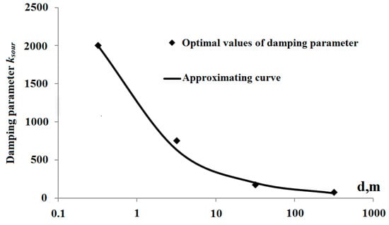 The plots suggest that the optimal value of ksour for the channel depth of 0.32 m is 2000 s−1; for 3.2 m, it is 750 s−1; for 32 m, it is 175 s−1; and for 320 m, it is 75 s−1. Based on the resulting data, the following curve of the damping parameter as a function of the channel depth is plotted (Figure 3):