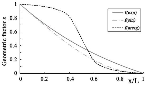 Next, we can define the obtained wave shape as a function of the form of changing damping coefficient ε. Three main options are considered, according to which the form is represented as the function from the exponent, the function from a sine, and the function from an antitangent. The damping coefficient was selected in compliance with Equation (21). A function distribution pattern is given in the following plot (Figure 4).