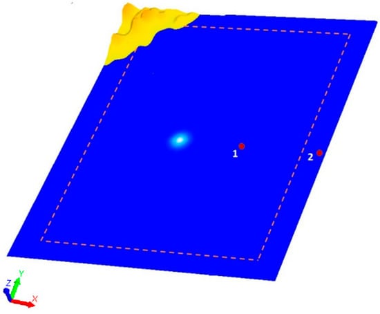 Figure 7 shows the problem schematic. The non-reflective boundary is implemented as a near-boundary damping layer simulating a porous region, which absorbs incident waves (shown with a dashed line). Figure 7 shows the locations of the tide gauges. Tide gauge 1 was placed in the way of the propagating wave, and tide gauge 2 was placed in the damping zone. The tide gauge data from point 1 allowed us to estimate the amplitude of the waves reflected from the side boundary, while tide gauge 2 indicated the degree of attenuation in the damping zone.