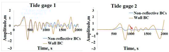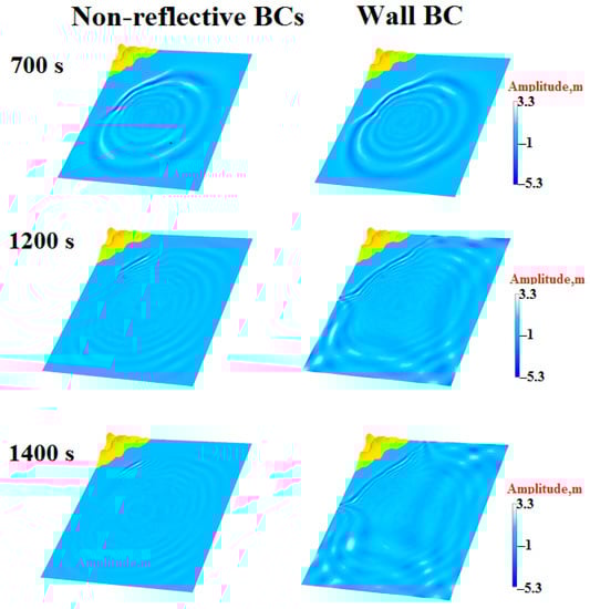 Figure 8 shows the time series for the free surface position for both cases. Figure 9 presents the tide gauge data at points 1 and 2. As one can see in Figure 8, at 700 s, when the waves reached the side boundaries the wave patterns in both cases were the same, which is evidenced by the tide gauge data at point 1 (Figure 9) up to 1000 s. In the first case (non-reflective boundary conditions), at 1200 s and 1400 s, one can see that the waves decayed when they reached the side boundaries, while in the second case (wall boundary conditions) one can clearly distinguish that the waves reflected from the side boundaries. The tide gauge data at point 2 (Figure 9) indicate that the amplitude of the first incident wave in the damping zone was 65% lower. At 1200 s, the wave reflected from the side wall came back to tide gauge 1. The pane with its data (Figure 9) shows that the wave amplitude at this point in space and time, considering the reflected wave, was 80 percent higher in the second case than in the first case.