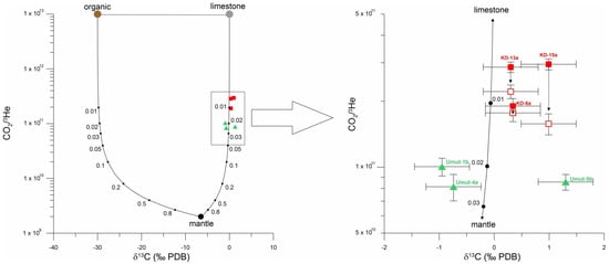 Several processes can alter the CO2/3He ratio in hydrothermal fluids. Phase separation may influence the CO2 [,] or the helium component, where the higher soluble CO2 preferentially remains in the liquid phase, whereas the less-soluble helium is preferentially separated into the gas phase. [] interpreted the low helium concentrations (0.7–2.2 ppmv) and low helium isotopic ratios (3He/4He = 0.96–2.06 Ra) of Kızıldere geothermal fluids, both of which showing a negative correlation to temperature by tapping of a remaining liquid phase after phase separation and the consequent depletion of helium in the liquid phase. Other processes that have the potential to alter the CO2/3He ratio in hydrothermal fluids are abiogenic reduction of CO2 to CH4 in the presence of reducing agents [,], and calcite precipitation [,]. Hydrothermal phase separation involving CO2, and calcite precipitation may also impact on the δ13C isotopic composition. The CO2/3He ratios of fluid samples from Kızıldere range from 1.8 to 9.2 × 1011 and from 0.7 to 1.1 × 1011 for fluid samples from Tekke Hamam [], higher than the average mantle value of ~2 × 109 []. Kızıldere samples cover a wider range of CO2/3He ratios, while ratios from Tekke Hamam are lower and more uniform. The δ13C isotope values of CO2 fall between 0.30 and 0.99 (‰ VPDB) for the samples from the Kızıldere geothermal field (wells KD -6, KD-13 and KD-15) and between −0.95 and +1.30 (‰ VPDB) for Tekke Hamam (mofettes Umut-1, -4 and -5), respectively. In a CO2/3He vs. δ13C-CO2 diagram (Figure 2), the data of our study plot on or close to a mixing hyperbola between magmatic CO2 and CO2 from interaction of geothermal fluids with limestone. There is no evidence for contributions of CO2 from organic-rich sediments. The diagram indicates that ~97% of CO2 from samples from Tekke Hamam and ~99% of CO2 from Kızıldere samples derives from fluid–limestone interactions, and only a small contribution is mantle-derived.