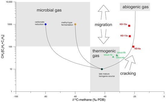 The CH4 content of the Kızıldere and Tekke Hamam gases generally vary between 1600 and 4500 ppmv which is very low compared to the dominant CO2 characteristic of the gases (reaching up to 98 vol.%), but surprisingly high compared to typical high-enthalpy geothermal gases of magmatic origin. The relatively high content of CH4 and C1/[C2 + C3] values observed in most of the gas samples from both fields were previously attributed to an input of possibly thermogenic methane [], given the fact that methane from pure magmatic gases is very low, almost free of methane []. The δ13C isotopic composition, together with the gas compositional ratio of hydrocarbons C1/[C2 + C3], also underpins the organic nature for the source of methane (Table 1 and Table 2). Figure 3 shows the distribution of the gas samples on a modified so-called “Bernard diagram”.