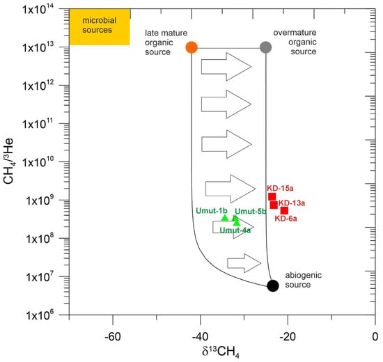 The stable isotopic composition of methane (δ13C, δ2H), along with the chemical composition of higher mass hydrocarbons (e.g., C2H6 (ethane), C3H8 (propane), C4H10 (butane)) and their respective ratios (C1/[C2 + C3], C1: CH4; C2: C2H6; C3: C3H8), has been used as a valuable tool for the elucidation of the possible sources of methane []. Typical δ13C values for microbial methane vary in a wide range between −110 and −60‰ [,] whereas the C1/[C2 + C3] ratio exhibit values greater than 1000 []. Thermogenically produced methane is characterized by more enriched δ13C isotopic values, typically changing between −50 and −20‰, with C1/[C2 + C3] ratio lower than 100 [,,]. In contrast to biogenic methane, abiogenic methane, emanating from sediment free mid ocean ridge systems were suggested to have enriched δ13C values (>−24‰ V-PDB), and hydrocarbon concentration ratios higher than 1000 [,,,] due to exchange with mantle carbon at high temperatures.