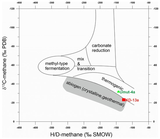 - Fiebig, J.; Woodland, A.B.; D’Alessandro, W.; Püttmann, W. Excess methane in continental hydrothermal emissions is abiogenic. Geology 2009, 37, 495–498. [Google Scholar] [CrossRef]