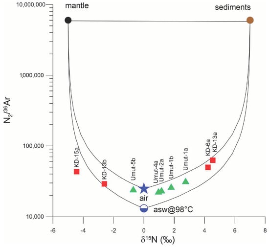 The stable isotopic composition of nitrogen δ15N (‰ vs. Air) has been used as a tracer for the delineation of the possible non–atmospheric nitrogen components present within terrestrial fluids issuing from various tectonic settings [,]. Nitrogen derived from (i) sediments (inorganic) of continental crust and/or subducted oceanic slab have δ15N values around +7‰, [], (ii) mantle derived N2, including unaltered ocean crust and N2 degassed from the upper mantle exhibit δ15N values close to −5‰, [], (iii) nitrogen related to organic sources of different degrees of maturity have values in the negative range, reaching −19‰ []. Since the isotopic characteristics of different nitrogen reservoirs within the subsurface coincide at some level, it is the general trend to compare the δ15N isotopic values with those of the elemental ratios, such as N2/36Ar [,] and N2/3He [] for the delineation of the possible nitrogen sources.