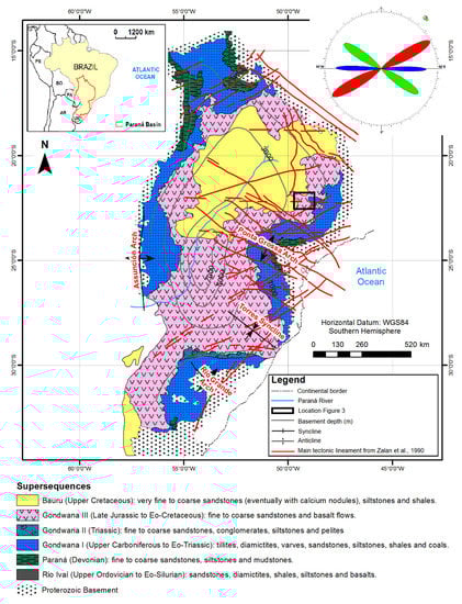 During the last decades, several researches were performed on the structural/tectonic setting of areas that have been traditionally considered tectonically stable. This is specifically true for those regions with economic potentiality related to their (inferred or present) resources, such as hydrocarbons, minerals and groundwater. The Paranà basin is an outstanding example (e.g., Zalán et al. []; Milani and Zalán []; Milani et al. []; Etchebehere et al. []). With the aim of unravelling the geological setting of geo-resources embedded in this basin, a large number of investigations have been conducted both at the regional (basin/continental-to-subcontinental) and at the local scale. Studies include the collection of geophysical data as well as field structural measurements (e.g., Milani []; Milani and Zalán []; Strugale et al. []; Costa et al. []; Fries et al. []). The gathered information revealed the main structural trends of the Precambrian basement and of the Paleozoic-to-Cenozoic covers (Zalán et al. []; Hasui et al. []), and confirmed the role of inherited weakness zones in the development and following deformation of the basin (Milani []; Zalán et al. []; Milani and Ramos []; Zalán et al. []; Almeida []; Campanha and Brito Neves []; Strugale et al. []). Specifically, the inherited crustal weaknesses relate to the Neoproterozoic crustal shear zone and mobile belts that allowed the ancient cratonic assemblage and formation of the Rodina and Gondwana supercontinents (Almeida []; Brito Neves and Cordani []; Almeida et al. []; Campanha and Brito Neves []). In the younger (Phanerozoic) tectonic history, these crustal weaknesses were properly oriented with the new tectonic stresses and experienced several stages of reactivations accommodating the intraplate deformation that affected the South America continental plate since the start of the west Gondwana disruption in the Lower Cretaceous (Richetti et al. []).