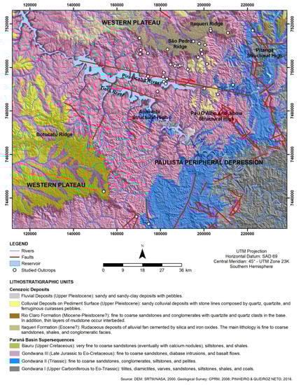 Faults and fractures analyzed in the present paper were collected in the São Pedro and Botucatu ridges (Figure 3). This region is located at the transition between two large morpho-structural units, the Western Plateau and the Paulista Peripheral Depression (Ross and Moroz []), close to the northeastern border of the Paraná Basin, in the State of São Paulo—Southeastern Brazil. The plateau is formed by the Eo-Cretaceous basalt flows of the Serra Geral Formation and the fine aeolian sandstones of the Botucatu Formation. These units are locally topped by sandy to rudaceous deposits cemented by silica and iron oxides (Itaqueri and Marilia Formations). The depression developed on the Triassic fine-to-conglomeratic aeolian/fluvial sandstones of the Pirambóia Formation (Caetano-Chang and Wu []), which are capped by an Upper Pleistocene colluvial sandy cover (Pinheiro and Queiroz Neto [,]). The origin of the large depression and its adjacent plateau is related to the Cenozoic circumdenudation process of the Paraná Basin margins, caused by large rivers entrenched in the old tectonic structures (Ab’Saber [,]; Pinheiro [], and Pinheiro and Queiroz Neto []).