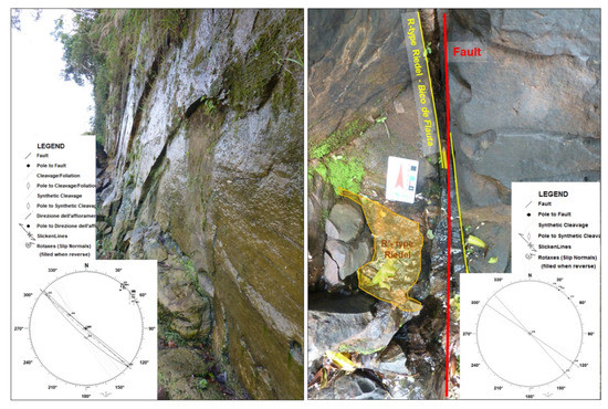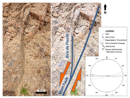 Obviously, the attribution to dynamic versus kinematic conditions of fractures at a given scale is not an easy task. The sub-ordered dimension and their increasing in size and frequency by approaching the main responsible fault are a good indicator, as well as their geometry in approaching the regional fault. Kinematically induced faults and fractures will never cut-cross their generating fault, and, by approaching it, they show a change in their attitude to face the main fault displacement. As an example, synthetic cleavage faults (e.g., R-type Riedel Fracture) will tend to rotate and lie parallel to the main fault to constitute the characteristic “recorder beak” or “bico de flauta” geometry (Figure 4). On the other hand, antithetic cleavage faults will rotate to a higher angle when joining the main fault.