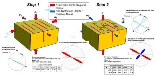 Development of systematic and non-systematic near-orthogonal joint systems. During Step 1 we assist to the initial development of the systematic joint set (i.e., normal to the σ3 component). During the successive Step 2, non-systematic joints develop and interact with both pre-existing and newly developed systematic joint to form the nearly orthogonal joint sets (see text for explanation). Data are projected on Schmidt Net (lower hemisphere) by Daisy 3 software. Wind-roses show the Gaussian fit of their azimuthal frequency.