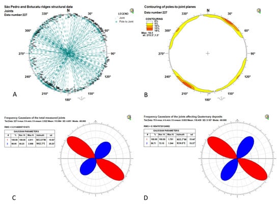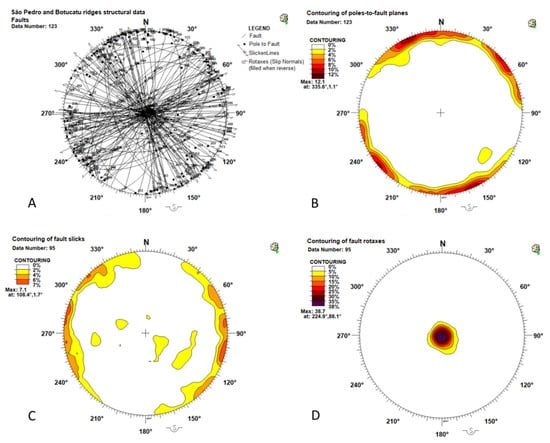 Figure 8A shows the stereoplot of the 123 faults with their kinematic vectors. Contouring of pole-to-fault planes highlights that all the measured faults are nearly sub-vertical and cluster in two main family sets trending NW-SE and NE-SW (Figure 8B). Notably, these two fault sets are nearly parallel to the main trends of the regional/basin scale faults (derived from literature e.g., Zalan et al. []) as those represented in Figure 2. This suggests that our fault data follow the regional structural grain and are representative of the main structural and tectonic trends.