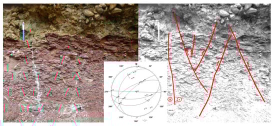 Part of the measured fault population propagated within Quaternary deposits. Figure 10 shows an example of conjugate reverse faults that cut through the Permian siltites of the Corumbataí Formation and the Quaternary fluvial conglomerate. These faults are NE-SW trending and displace the original contact/boundary between the siltites and the continental conglomerates. At this field measurement site, an E-W trending right-lateral strike-slip fault is also present.