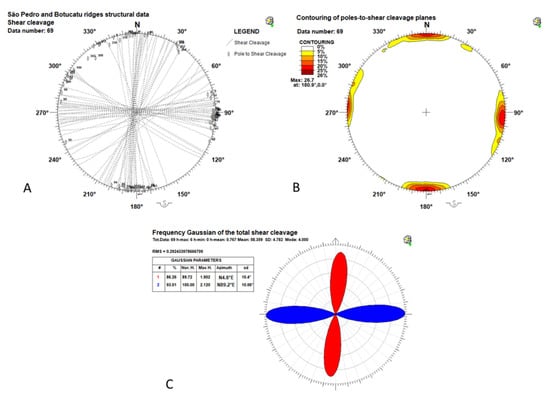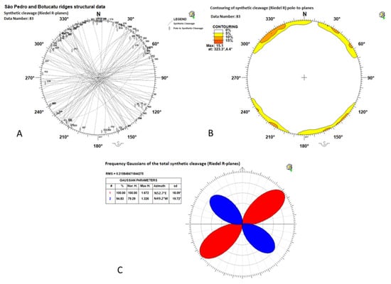 Total synthetic cleavage (Riedel R-planes) analysis and polymodal Gaussian fit. (A). Stereoplot of the synthetic cleavage planes and pole-to-planes. (B). Synthetic cleavage contouring of the pole-to-planes. (C). Polymodal Gaussian fit. (A,B): data are projected on Schmidt Net (lower hemisphere) by Daisy 3 software.