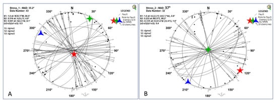 Results of multiple Monte Carlo fault inversion showing the two paleostresses characterized by the switch of the minimum and maximum horizontal stress component. (A). The first solution in characterized by NW-SE minimum horizontal stress component and NE-SW trending maximum horizontal stress component, (B). The second solution is characterized by NW-SE maximum horizontal stress component and NE-SW minimum horizontal stress component. Data are projected on Schmidt Net (lower hemisphere) by Daisy3 software.