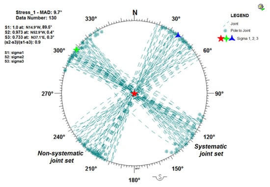 Results of Monte Carlo direct inversion of the classified systematic and non-systematic joints. Data are projected on Schmidt Net (lower hemisphere) by Daisy 3 software.