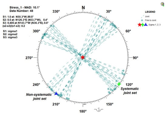 The approach used in the present paper is again the classical presented Monte Carlo, i.e., the software routinely generates random stress tensors. Each of these stresses is then applied to all the joints and a deviation angle is computed between the stress tensor and the normal to the joints. This comparison is conducted twice, with the σ3 orientation (if the joint is a systematic one), and with the σ2 (in case the joint is a non-systematic). The smaller angle will provide the identification of the fracture and will be kept. The average values of all fractures will provide the mean angular deviation, MAD.