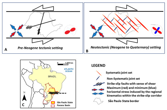 A third E-W trending structural direction affecting the study region has been described by authors (e.g., Bjonberg []; Curie []; Zalán et al. [], Saadi []; Saad []; Facincani []; Hasui []; Pinheiro et al. []) and corresponds to morphotectonic directions detected from synthetic scaled images (air photo mosaics or satellite images), faults or fault networks, fault corridors with dimensions ranging from the few meters of single fault at the outcrop scale, to the hundreds of kilometers of the fault corridors and shear zones at the continental or subcontinental scale. Prevailing strike-slip kinematics have been inferred for these E-W structural trends (Morales []; Riccomini []; Hasui []). The existence of regional strike-slip fault strands, nearly E-W oriented and affecting the western Paulista region (eastern border of the Paraná basin), has been inferred by Saad [], Riccomini [] and Etchebehere et al. []. Within the deformation zone of this corridor, authors frame the found sinistral movement along NNW-SSE fault set and dextral movement along NW-SE faults. This kinematic suggests a regional dextral shear along the E-W corridor (Riccomini [,]). Hasui et al. [] and Hasui [] advanced the existence of a regional E-W, strike-slip regime related to the current South America plate drift. Transpressive and transtensive deformation is associated to this tectonic setting along the E-W shear zone. A link has been hypothesized between the E-W trending offshore fracture zones in the South Atlantic (and the nearly parallel on land shear zones located along the same parallel (e.g., Saadi []; Hasui []; Pinheiro et al. []; Vasconcelos et al. []; Pinheiro and Cianfarra []).