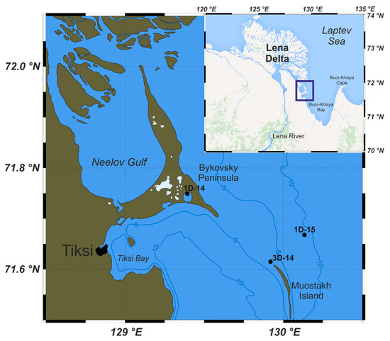 Three drilling cores were obtained during polar expeditions in 2014 (1–14 April, the 1D-14 (drilled 2–4 April) and 3D-14 (drilled 11–12 April)) and 2015 (28 March–14 April, the 1D-15 drilled 5–10 April), which were organised by the Pacific Oceanological Institute FEB RAS (Vladivostok), the National Research Tomsk Polytechnic University (Tomsk), and the Melnikov Permafrost Institute SB RAS (Yakutsk), in collaboration with Lomonosov Moscow State University (Moscow) and Shirshov Institute of Oceanology RAS (Moscow). Sediment cores were collected in the Buor-Khaya Bay using drilling apparatus PBU-2 coupled with skidding machine MTCh-4. Collection sites are located southeast of the Lena Delta near the Bykovsky Peninsula at the Buor-Khaya Bay (Figure 1). General characteristics of the drilled wells are presented in Table 1.