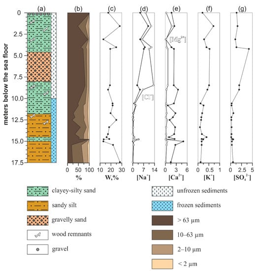 The 1D-14 profile varies drastically in ion concentration of pore water, especially in thawed strata (Figure 2) where deposits show negative temperature [,,]. The temperature for the thawed section was not below −1 °C, while subsea permafrost differs in temperature below −1.4 °C. The concentrations of ions from the thawed section vary as follows: 6.25–25.2 (mean 13.8) g/L of Na+; 0.29–0.90 (mean 0.70) g/L of K+; 0.15–2.15 (mean 0.92) g/L of Ca2+; 0.10–2.83 (mean 1.08) g/L of Mg2+; 6.79–49.7 (mean 20.5) g/L of Cl–; 0.06–10.2 (mean 3.45) g/L of SO42–. The irregularity in ion concentration is considerable for sodium cations and chlorides. A significant salinity gradient is located above the permafrost boundary. The permafrost section differs in considerably lower concentrations of major ions in pore water which are comparable close to Yedoma Ice Complex deposits []. Values vary from 0.01–0.89 (mean 0.28) g/L of Na+; 0.01–0.27 (mean 0.10) g/L of K+; 0.15–1.32 (mean 0.63) g/L of Ca2+; 0.07–0.55 (mean 0.25) g/L of Mg2+; 0.02–1.36 (mean 0.45) g/L of Cl–; 0.03–0.57 (mean 0.21) g/L of SO42–.