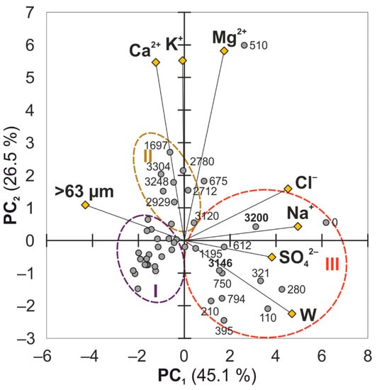 The PCA biplot shows the antagonism of the sand concentration in deposits with the moisture content. The concentration of chlorides, sulphates, and sodium correlates to the sand content and confirms their accumulation in sediments with high moisture content. The sand samples form a dense cluster axis to the lower left in the PCA biplot (cluster I). These samples relate predominantly to lower and middle sections of the 1D-15 profile. They are characterised by a reduced salinity of the pore water and simultaneous low moisture content as well. Only two sand samples, 3146 and 3200, are displaced to the right and differ in their high contents of vegetable debris, resulting in the accumulation of the moisture and dissolved salts as well. The cluster II differs from other samples with elevated content in K+, Ca2+, and Mg2+ and relatively moderate values of the other parameters. The sample 510 differs drastically due to its higher concentration of K+, Ca2+, and Mg2+. The third cluster includes the samples mostly taken from the top section of the 1D-15 sediment core and these differ in high moisture content and salinity of the pore water.