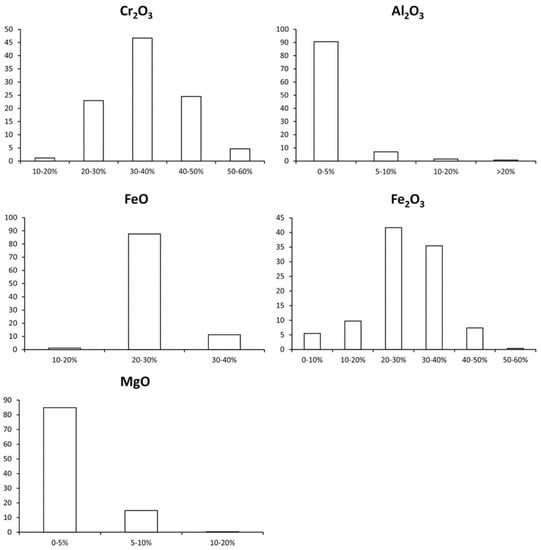 Frequency distribution of Cr2O3, Al2O3, FeO, Fe2O3, and MgO in the studied spinels.