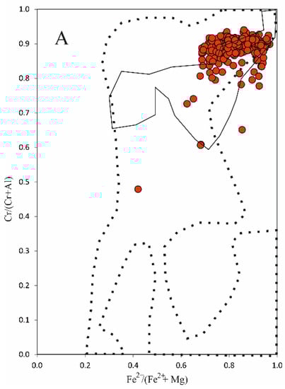 - Barnes, S.J.; Roeder, P.L. The range of spinel compositions in terrestrial mafic and ultramafic rocks. J. Petrol. 2001, 42, 2279–2302. [Google Scholar] [CrossRef]