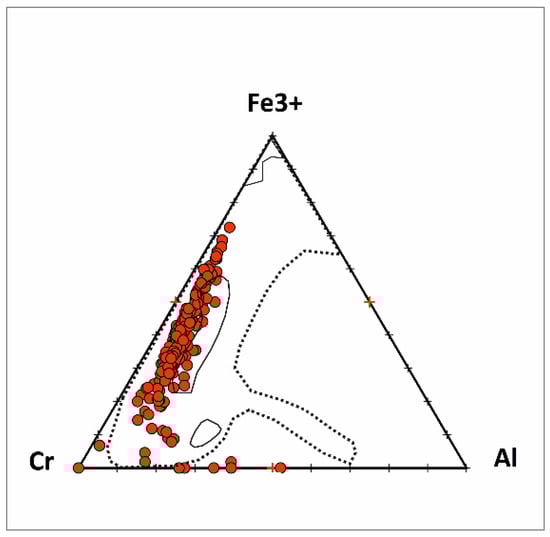 To understand the likely provenance for these spinels, we compared them with the database of [11]. If we consider the Cr# vs. Mg# diagram, our spinels fall into the field or close to the field of alkali basalts, lamprophyres, and related rocks and worldwide Alaskan zoned ultramafic complexes (Figure 4). Anyway, they differ from the closest Alaskan complexes of the Urals, that, by the way, are also younger, showing a comparable Cr# in the range 0.60–0.85, but lower Fe# in the range 0.2–0.8 [44,45]. When inserted into the ternary Cr-Fe3+-Al diagram, they perfectly fall into the field of alkali basalts, lamprophyres, and related rocks, and are similar to the worldwide Alaskan ultramafic complexes [11] (Figure 5). However, we were unable to find source areas with similar compositions.