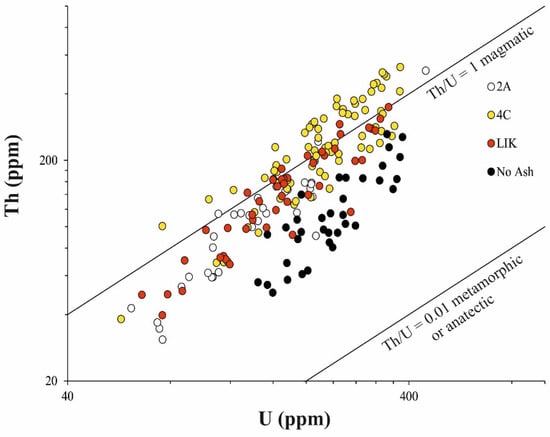 To discriminate between possible sources, some provenance diagrams have been used. According to the Th vs. U diagram [31] (Figure 6), zircons with Th/U ratios lower than 0.1 are metamorphic, and those with values above 0.1 are magmatic, even if [54] suggested that recrystallized and newly grown metamorphic zircons often have high Th/U ratios. The zircons studied here show values close to or greater than 1, so they can be considered as magmatic. It is interesting to notice that all the occurrences of zircons show subparallel trends and those from the No Ash level are usually lower in Th for a given U content.