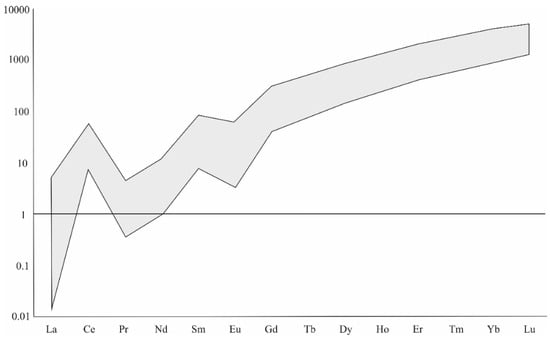In zircons, Hf and Y, which can be considered as minor elements for zircons, are in the ranges 5800–20,000 ppm and 100–7200 ppm, respectively. In particular, Hf is in the range 5800–14,700 ppm for the No Ash sample (mean 9195 ± 2329), 7860–12,500 ppm for LIK (mean 9626 ± 992), 6300–18,900 ppm for 4C (mean 9693 ± 1769), and 8600–20,260 ppm for 2A (mean 12,351 ± 2597). Yttrium is in the range 260–2220 ppm for the No Ash sample (mean 1029 ± 510), 540–2800 ppm for LIK (mean 1711 ± 601), 104–5300 ppm for 4C (mean 2562 ± 1058), and 1060–7170 ppm for 2A (mean 2717 ± 1347). The ionic radius of Zr is most closely matched by the smaller radii HREE than the larger LREE, so that the abundances of HREE are larger than those of LREE [31]. Given this, the total content of LREE (La to Pr) is lower than about 100 ppm (No Ash: 4–34 ppm; LIK: 6–45 ppm; 4C: 9–103 ppm; 2A: 7–53 ppm), that of MREE (Nd to Gd) is lower than about 250 ppm (No Ash: 8–41 ppm; LIK: 12–106 ppm; 4C: 7–248 ppm; 2A: 18–179 ppm), and that of HREE (Tb to Lu) is in the range 55–4055 (No Ash: 354–1922 ppm; LIK: 421–1972 ppm; 4C: 110–3865 ppm; 2A: 770–4288 ppm). The values of P can be very different in zircons according to the host rocks. This is in the range 59–2615 ppm for the studied zircons (No Ash: 125–814 ppm; LIK: 185–838 ppm; 4C: 59–1167 ppm; 2A: 418–2615 ppm). According to [31], Th and U are somewhat compatible with Zr (ionic radii: Th4+ 1.05 Å, U4+ 1.00 Å) and occur in crustal zircon with abundances typically ranging from tens- to thousands-of-ppm. Thorium is in the range 30–529 ppm for the studied zircons (No Ash: 50–263 ppm; LIK: 40–349 ppm; 4C: 38–529 ppm; 2A: 30–510 ppm), while U is in the range 57–447 ppm (No Ash: 144–383 ppm; LIK: 66–348 ppm; 4C: 57–377 ppm; 2A: 61–447 ppm).
