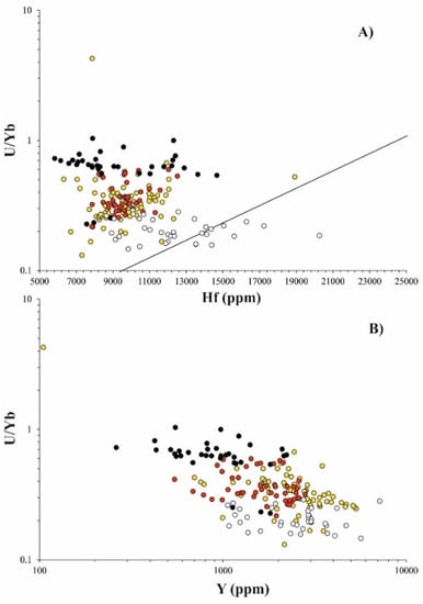 (A) U/Yb vs. Hf and (B) U/Yb vs. Y diagrams according to [57]. Symbols as in Figure 7.