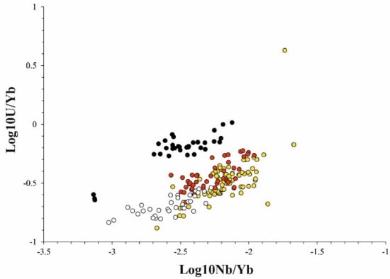 Log10U/Yb vs. Log10Nb/Yb diagram according to [58]. Symbols as in Figure 7.