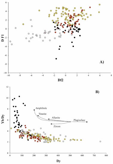 (A) DF1 vs. DF2 and (B) Yb/Dy vs. Dy diagrams according to [58]. Symbols as in Figure 7.