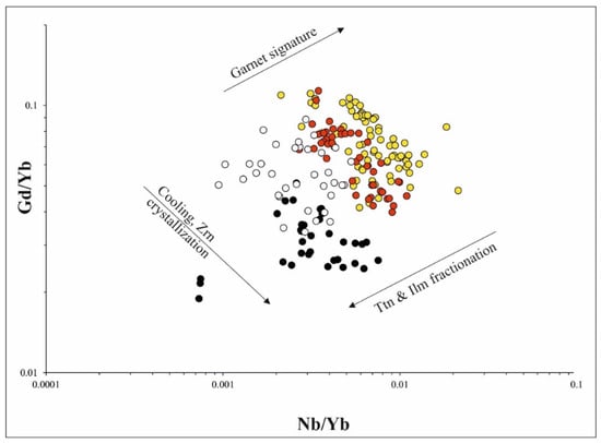 Gd/Yb vs. Nb/Yb diagram according to [57]. Symbols as in Figure 7.
