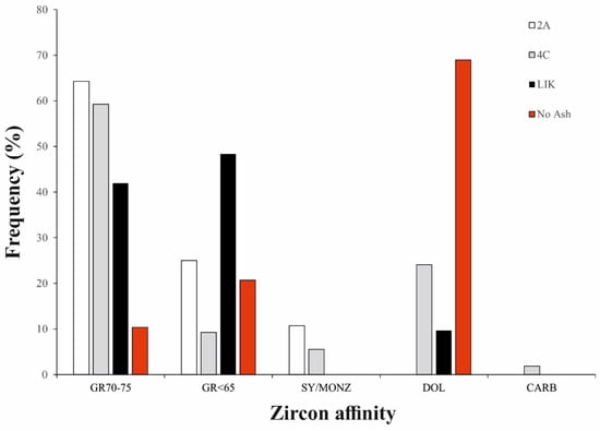Belousova et al. (2002) [27] studied the trace and rare earth elements in igneous zircons from several lithologies. Their classification trees based on recursive partitioning techniques provide a rapid means of relating parent rock type to zircon trace element analysis at confidence levels of 75% or more. By applying those criteria, zircons from the No Ash level are predominantly (about 70%) from doleritic affinity rocks; LIK zircons are almost equally subdivided between granitoids with SiO2 < 65%, and granitoids with SiO2 higher than 70–75%, in 4C and 2A levels with more than 50% of zircons, are assigned to granitoids with SiO2 greater than in the 70–75% group (Figure 12). In the most recent levels, there are also about 10% of zircons with a syenitic/monzonitic affinity (Figure 12).