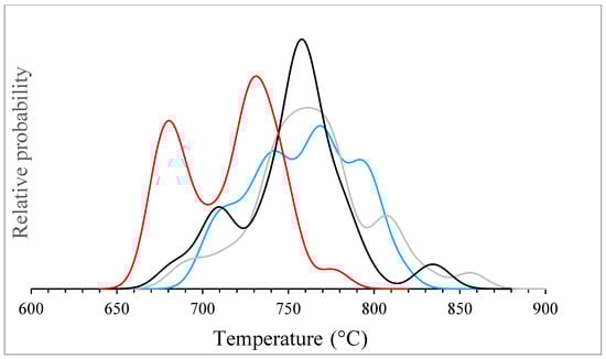 Density curve of zircon crystallization temperatures. Blu line: 2a; grey line: 4c, black line: Likhall; red line: No-ash.