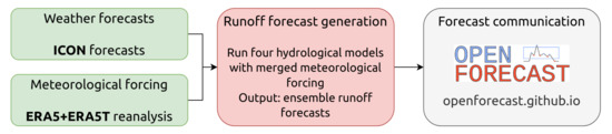 First, for each gauge of interest, meteorological forcing is updated based on the latest ERA5T and ICON data (see Section 2.2). Then, the updated meteorological forcing data is used as input to four hydrological models (Section 2.3) to obtain recent runoff forecasts. Finally, the calculated forecasts are communicated on the project’s website (https://openforecast.github.io, accessed on 14 December 2021).