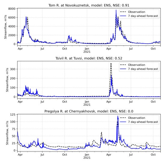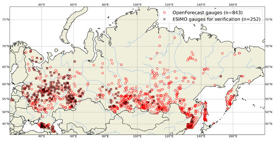 OpenForecast is the first national-scale operational runoff forecasting system in Russia [20,24] that has been developed since 2018 by the consortium of researchers from the State Hydrological Institute (Saint-Petersburg, Russia), the Water Problems Institute (Moscow, Russia), the Central Administration for Hydrometeorology and Ecology Monitoring (Moscow, Russia), and the Lomonosov Moscow State University (Moscow, Russia) on the funds provided by the Russian Foundation for Basic Research. The system was launched on 14 March 2020. Since then, OpenForecast operationally provided one week ahead runoff forecasts for 843 gauges across Russia. In our previous research studies, we presented: (1) the proof of concept of runoff forecasting service design (OpenForecast v1 [24]) that has been evaluated for three pilot river basins in the European part of Russia for the period from 1 March 2019 to 30 April 2019 (61 days), and (2) the second version of the OpenForecast system (OpenForecast v2 [20]) that has been scaled to 834 gauges across Russia and then evaluated for the period from 14 March 2020 to 6 July 2020 (115 days). Both studies confirmed OpenForecast as a successful example of the state-of-the-art national-scale runoff forecasting system. However, short evaluation periods leave room for speculation about the system’s consistency and robustness.
