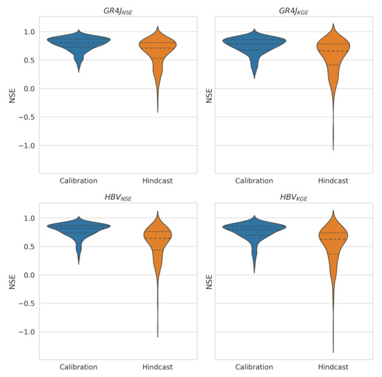 Differences between individual hydrological model performances in terms of NSE for calibration and hindcast (evaluation) periods. Violin plots represent the distribution of estimated values within the full range of variation. Dashed lines show the quantiles of 25, 50, and 75%, respectively.